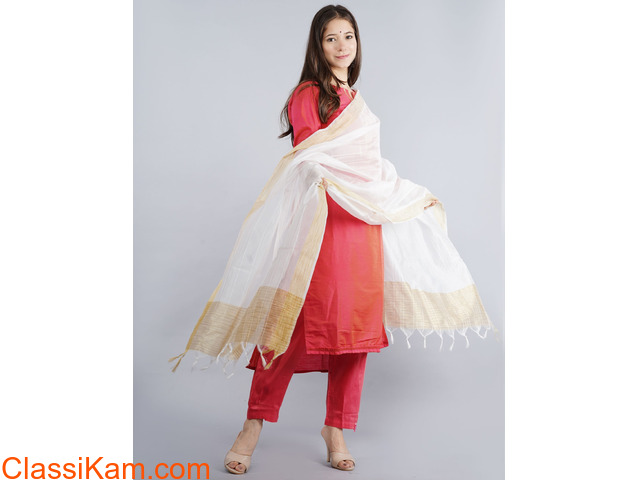Let your charm ooze out in this flabbergasting three-piece kurta set by Naaviv. The kurta has a high low hem along with three quarter sleeves, twinned with Straight Pant and an enticing cotton dupatta to add a dash of grace to your style. Go enormously elegant with this descent yet classic Kurta set. A perfect way to express your love for ethnic wear.