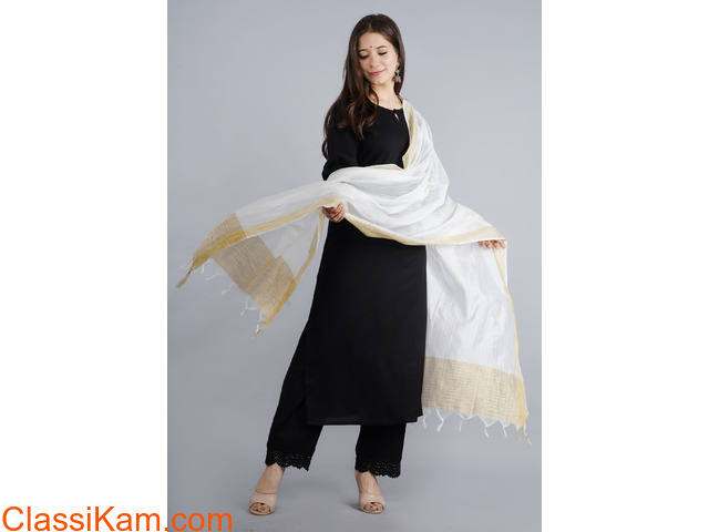 Here comes the classic with immense elegance and panache. The three piece Kurta set is embellished with White Cotton Duppatta. The kurta is styled with round neck and three fourth sleeves and certainly the palazzo is something you can not take your eyes off , intricate lace styling to give the exemplary flair and astounding look. Dazzle the day with this beautiful black kurta set and it will be the paradigm of elegance in your closet.